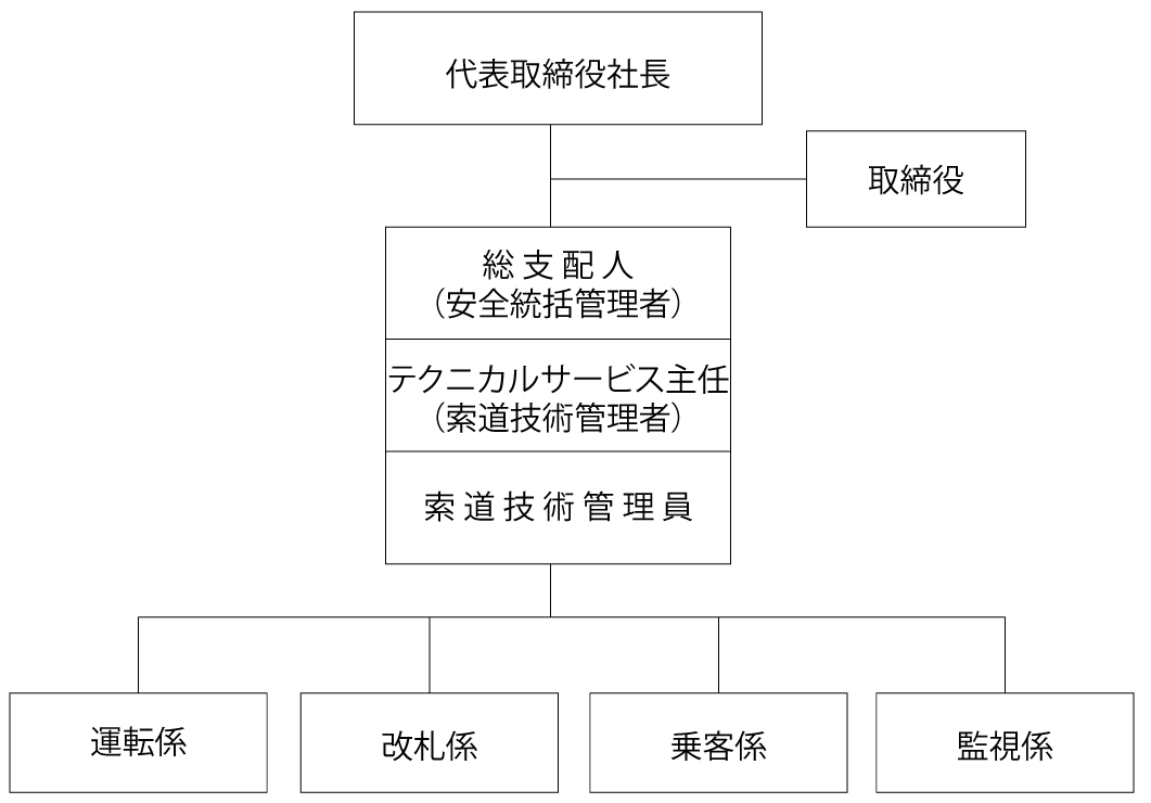 | 社長 | 輸送の安全の確保に関する最終的な責任を負う。 索道事業の輸送の安全確保に関する業務を統括する。 |