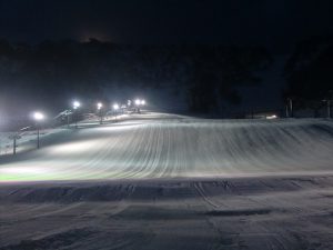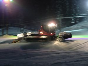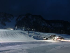 おはようございます。昨日のナイター営業終了後あたりから雪が降りだしていましたが、まとまった降雪ではなく積雪もほぼありませんでした。圧雪隊の情報では夜は水気の含んだ雪だったようで、仕上がりにかなり苦労しているようです。出来る限りきれいに仕上がるよう、がんばって作業中ですよ。