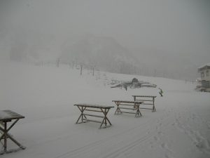 おはようございます。今朝も雪が降り続いている一里野です。予報では雪も落ち着いてくるようですが、雪が続いていていますね。今日は風もあまりなく、ゴンドラも順調に運行しています。ゲレンデは新しい雪を楽しめますよ。