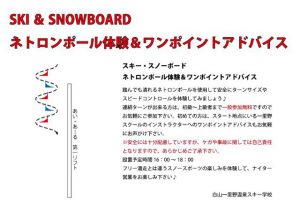 白山一里野温泉スキー場スタッフブログ フレッシュな雪を楽しんで下さい! 2017.02.11 おはようございます。昨晩からの雪が今日も新しい雪としてゲレンデを覆っています。フレッシュな雪をおもいきり楽しめますよ。予報では一日雪ですが、せっかくの祝日、天気も落ち着いてきてほしいですね。 今日は、17:00よりナイター営業です。4時間券、回数券でナイター突入OKですので、ゆっくり用意しても十分時間はありますよ。 本日、16:00~18:00まで、一里野温泉スキー学校 スノーボードスクールが、あいあ~る第1リフト降り場横ゲレンデで「ネトロンポール体験&ワンポイントアドバイス」を開催します。ワンランクアップを目指す方、スノースポーツに興味のある方は、ぜひご参加ください。料金は無料ですよ! スキー場までのアクセス道路は、除雪は入っていますが路面には積雪があります。ゆっくり安全運転でご来場ください。本日も皆さんのご来場をお待ちしています。 天候:雪 気温:-3℃ 風:微風 運行:ゴンドラ・あいあ~る第1・第2・クワッドリフト・のだいら第1・第2リフト・中の原リフト・全面滑走可能・キッズパーク営業中!