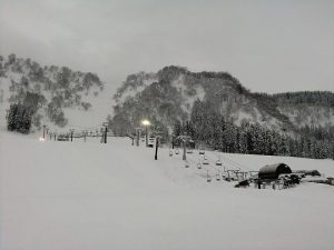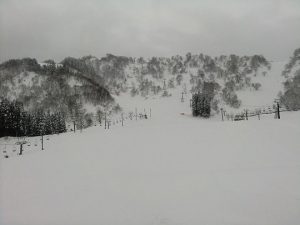 おはようございます。昨日までの降雪も落ち着き、今朝は小雪がチラチラ舞うぐらいの、ほぼ曇と言っていい天気となっています。昨日からの積雪は5cm程度でしょうか。気温も山麓部で-2℃となっていますので、今日は冷えて良く締まったバーンを楽しめるのでは。