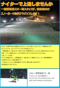 白山一里野温泉スキー場スタッフブログ 明日、土曜日はナイター営業日! 2017.02.17 明日の土曜日は、ナイター営業日です。スキー場スタッフによる初級者向けスノーボードアドバイスも開催予定です。広々ナイターゲレンデで上達を目指しませんか?