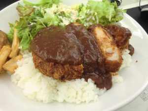 食べ盛り?の学生さんにおトクなサービス!カレーやスタミナ丼のごはんメニューの食券と一緒に学生証提示で、ごはん大盛り無料です。ガッツリ行きたい人におすすめです。画像のデミグラスソースのBIGカツセットも、もちろん、ごはん大盛りOK!ですよ。