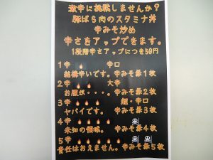 券売機で「スタミナ丼 辛みそ炒め」の食券と、「辛みそニンニク」の食券1枚50円を購入してください。1枚追加するごとにに辛さがアップ!激辛への挑戦してみませんか?