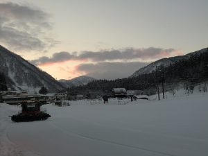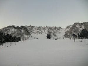 おはようございます。ここ数日、雪の降る日が続きましたが、今朝は久々に晴れた一里野の朝です。昨晩は積もるような雪にはならなかったようですが、ゲレンデには雪は十分となっています。