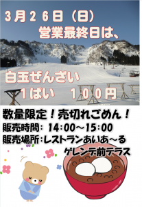 今シーズンの営業最終日3月26日(日)に、白玉ぜんざいの振舞(販売)を行います!