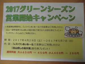 白山一里野温泉スキー場スタッフブログ 準備は着々と。 2017.04.28 明日の営業開始に向けて、準備が進んでいます。明日から5月7日(日)までの期間に『レストランあいあ~る』を利用すると天領入浴割引券をプレゼント! センターハウス1階には卓球台のセットもOK!1台1時間(ラケット・ボールつき)200円で、軽く体を動かせますよ。 また、スマートホンの電池が足りない!というときに緊急用の充電器(30分200円)も今シーズンより登場! さらに、『モンスターエナジー』もレストラン内の専用冷蔵庫にセットされました。 建物の外では、スタッフみんなで『バーベキュー広場』のテント設置など用意をしてくれています。 『バーベキュー広場』は、ゴールデンウィーク中にまだ空きのある日がありますよ。食材、炭、食器などこちらで用意して手ぶらでバーベキューを楽しめる『手ぶらBBQ』セットも3日前まで受付しています。 センターハウス前のアスファルトもきれいになりましたね。 グリーンシーズンの一里野をゴールデンウィークも楽しんで下さい。