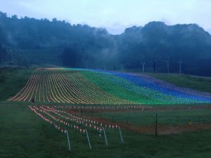白山一里野温泉スキー場スタッフブログ 灯りでつなぐ1300年! 2017.07.23 日没までまって、あたりが薄暗くなってくるとゲレンデのイルミネーションの灯りがともり始めました。 一里野公園もイルミネーションで飾り付けられてきれいですね。 正面ゲレンデは、加賀禅定道をイメージしたレインボーの灯りの流れに感動! さらに、30分ほどすると虹から手取川の流れをイメージした青い灯りに切り替わります。 写真では伝わらない美しさですよ。(写真の腕の問題もありますが・・・。) ぜひ、現地で直に見てください。 灯りの色が切り替わる瞬間は、特に感動です!