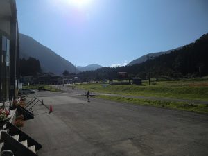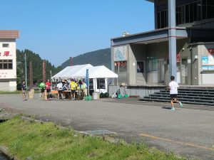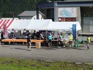 一里野温泉スキー場のセンターハウス前は、給水地点となっているので、続々と選手が到着して給水や一里野温泉観光協会さんが用意した報恩講汁も振る舞われています。トップの選手は8:00前には通過していきましたよ。