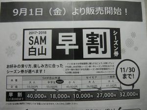 一里野温泉スキー場管理事務所では2017-18SAM白山シーズン券も販売中ですので、紅葉狩りのドライブのついでに、おトクなシーズン券も手に入れては。