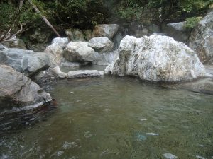 露天風呂には頭上にひさしや屋根が無いので、がっしりした岩の湯船に浸かると野天気分を味わえますよ。