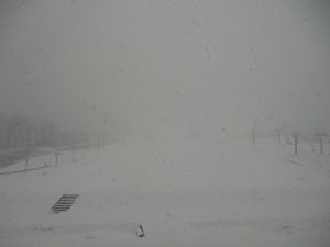 このところ晴れの日が続いてゲレンデの雪も山麓部は消えていましたが、今朝は雪が降り続いて、また真っ白な雪景色となっています。