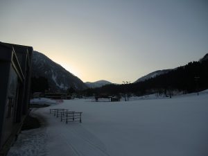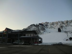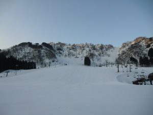スキー場までのアクセス道路は、乾いた路面で日中はノーマルタイヤでも大丈夫です。スピードの出しすぎに注意してご来場ください。