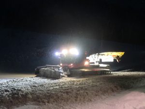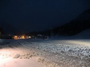 センターハウス前は、まだ雪が少なく駐車場の除雪された雪を入れて圧雪隊が整えてくれています。