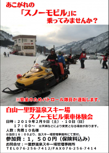 白山一里野温泉スキー場スタッフブログ 今週末、スノーモビル乗車体験会開催決定! 2019.02.06 前回、試験的開催で大変好評だったスノーモビル乗車体験会。 今週末も開催決定! 体験会は17:00スタート! スキー場管理事務所で当日16:00より受付します。 めったに乗れないスノーモビルに乗車してみませんか? 開催日時 2019年2月9日(土)、10日(日) 17:00~ ※天候、ゲレンデ状況などにより予告なく変更、休止する場合がございます。 受付 一里野温泉管理事務所 当日16:00より受付 参加費 1500円(保険料込み)