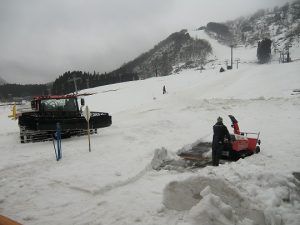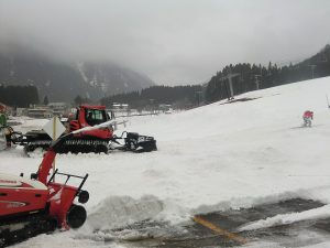 スタッフがこまめに雪入れ作業を実施しゲレンデを維持してきましたが、週末の営業に向けて、積雪が薄くなっている、らくらくコースからゴンドラ山麓駅舎までの通路確保のため、のだいらロッヂ方面より雪入れ作業行いました。