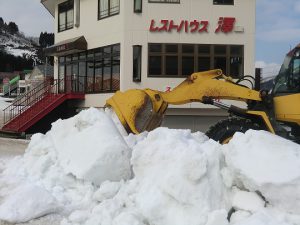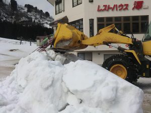 白山一里野温泉スキー場スタッフブログ 雪入れ作業。 2019.03.01 センターハウス正面にも雪を入れています。 安全確保には十分気を付けていますが、作業中に重機などには絶対に近寄らないようにお願い致します。