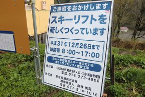 白山一里野温泉スキー場スタッフブログ のだいらロッジ付近の様子。 2019.04.30 小雨があがったので、この晴れ間を活用して「のだいらロッジ」方面まで。 一里野ファンの方も、そうでない方も、とっても気になっていると思われる、「のだいら新リフト」架け替え工事の様子を見て来ました。 大型連休中という事で工事はお休みです。 すでに旧のだいら第1リフトの支柱などは撤去されています。 新リフトの線下にあたると思われるところの木々が伐採されていました。 新リフトの乗り場は、ちょうど「のだいらロッジ」の前あたりになるようです。 「のだいらロッジ」前から「のだいらゲレンデ」山頂まで一気に行けるようになる予定ですよ。 良質の雪を楽しめる「のだいらゲレンデ」へのアクセスが、これまで以上に楽になりそうです。 工事も事故なく無事に終わって欲しいですね。 この冬を期待して皆さんシーズンをお待ちください。 ※テニスコートは新リフト架け替え工事のため今シーズンは休止となります。 白山一里野温泉スキー場グリーンシーズン http://ai1423xu6f.smartrelease.jp/wp/ichirino/