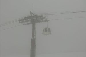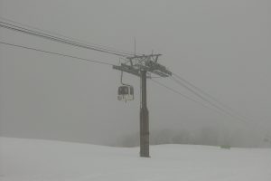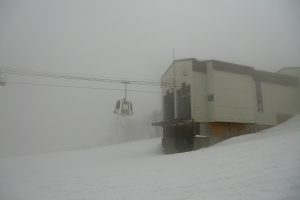 ゴンドラで山頂へ上がってみるとガスが、かかっていますが細かい雪が降っています!