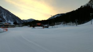朝イチ、緩むまではカリッと固めのバーンなので、スピードコントロールに気を付けて滑ってください。