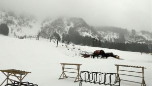 朝出勤してきたときは雨だった一里野ですが、朝6:30過ぎ現在、雪へと変わっています。
