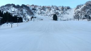朝イチは固めのバーン、雪質はザラメ、スピードコントロールに気を付けて滑走を楽しんでください。