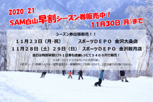 SAM白山の早割シーズン券は11月30日(月)までとなります。